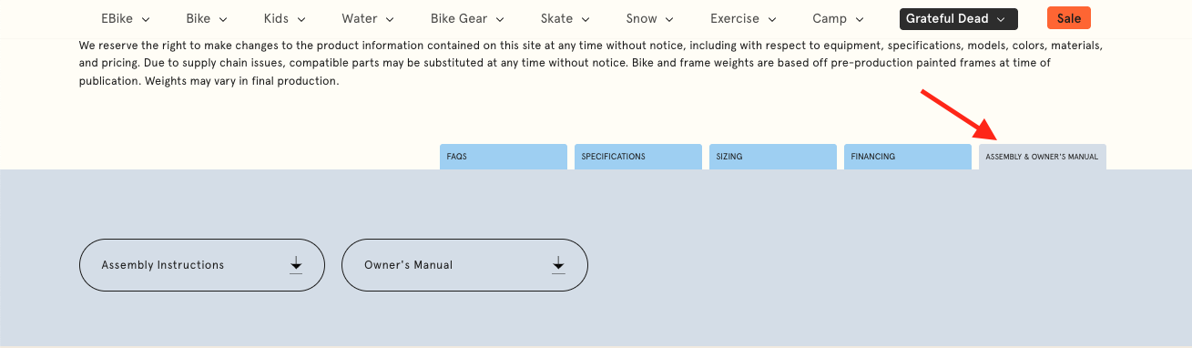 Bike & EBike Assembly & Owner's ManualsUpdated 14 days agoGo to the product page of the item you have. Scroll down to the blue section and select the tab called "Assembly & Owner's Manuals". Was this article helpful? YesNo